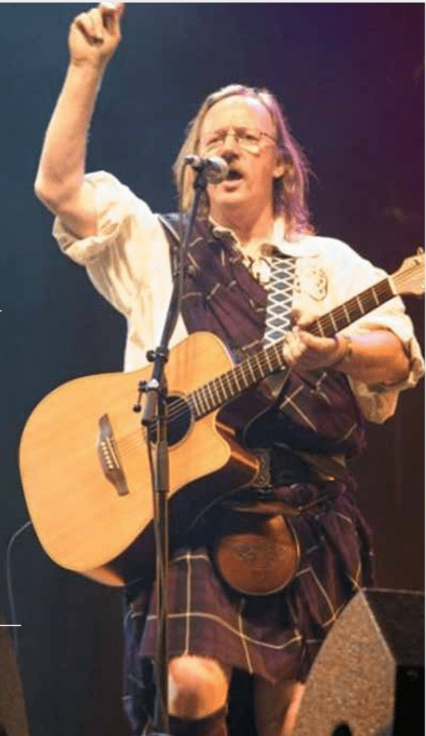 Iklædt højlands kilt spiller og synger Bob Ferguson, Rock, Skotske, Irske og egne sange.