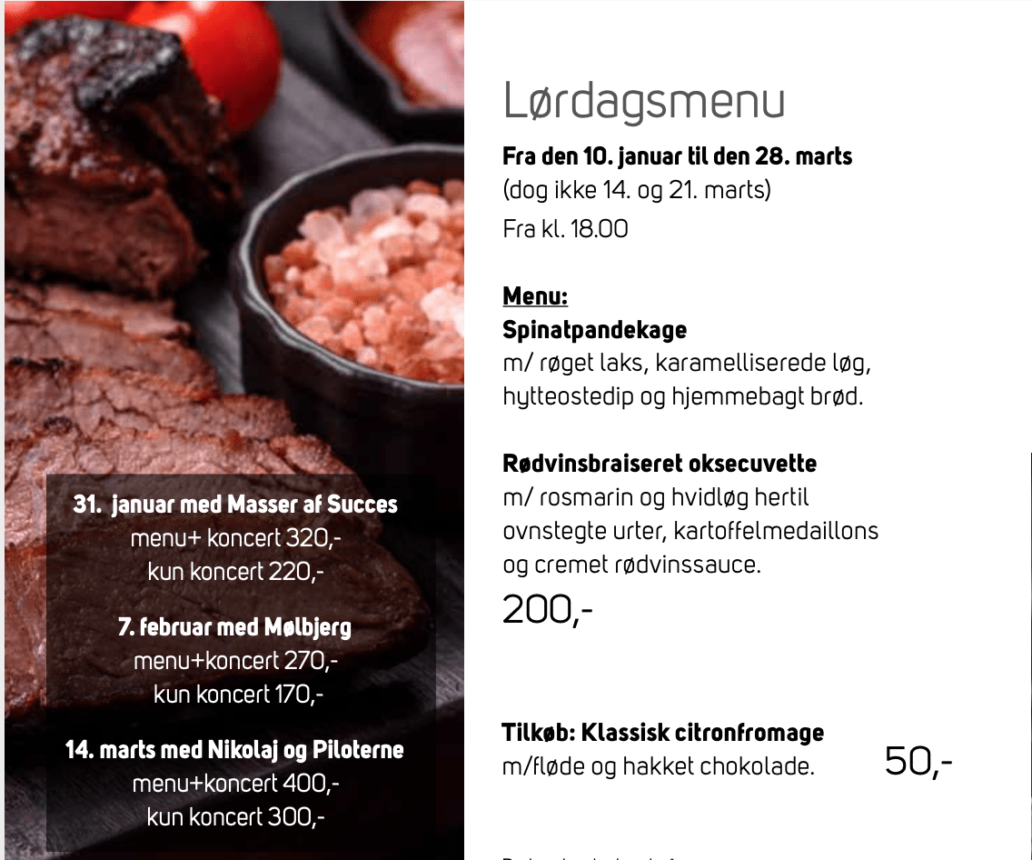 Restaurant Tannishus Tannisbugtvej 123, Tversted, DanmarkMenu: Spinatpandekager m/ røget laks, karamelliserede løg, hytteostedip og hjemmebagt brød Rødvinsbraiseret oksecuvette m/ rosmarin og hvidløg hertil ovnstegte urter, kartoffelmedaillons og cremet rødvinssauce 2 retter kr. 200,- (dog ikke 14/2 og 21/3) Tilkøb: Klassisk citronfromage m/fløde og hakket chokolade Den 31 januar med Masser af Succes menu+ koncert 320,- kun koncert 220,- Den 7 […]
