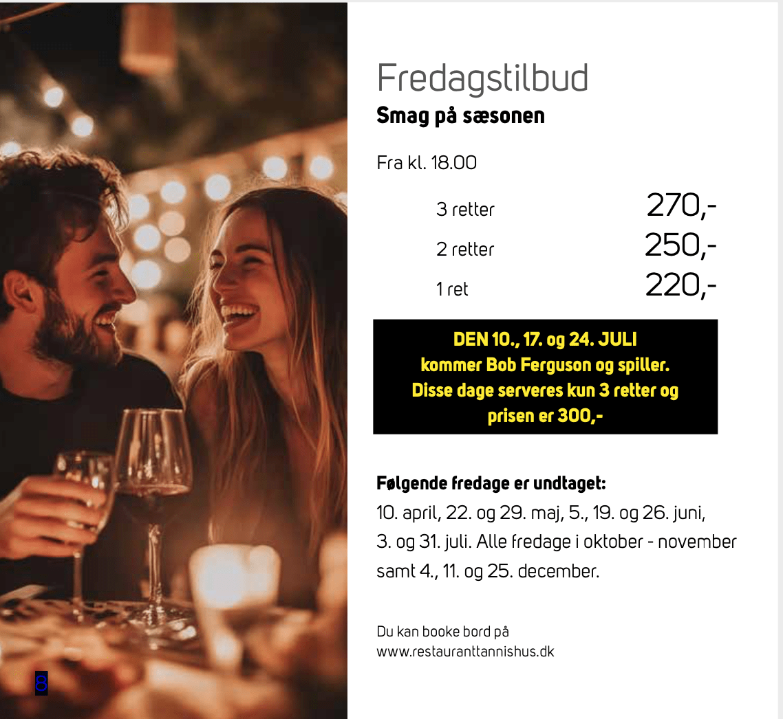 Restaurant Tannishus Tannisbugtvej 123, Tversted, DanmarkFredagstilbud Smag på sæsonen Fra kl. 18.00 3 retter 270,- 2 retter 250,- 1 ret 220,- DEN 10., 17. og 24. JULI kommer Bob Ferguson og spiller. Disse dage serveres kun 3 retter og prisen er 300,- Følgende fredage er undtaget: 10. april, 22. og 29. maj, 5., 19. og 26. juni, 3. og 31. […]